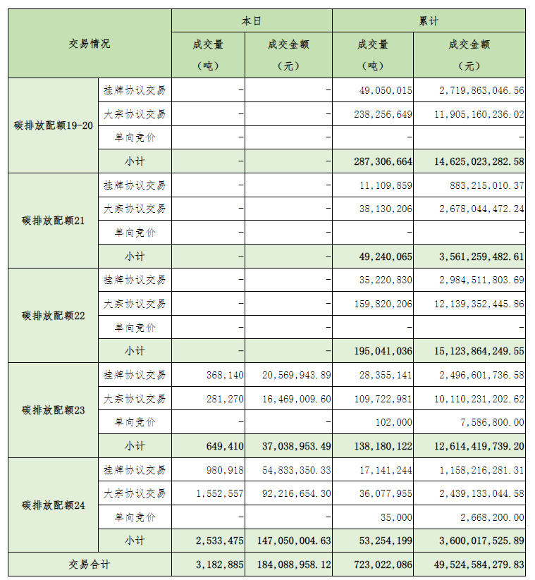 今日全国碳排放权交易市场成交总量3,182,885吨,成交总额184,088,958.12元,成交均价57.84元/吨。