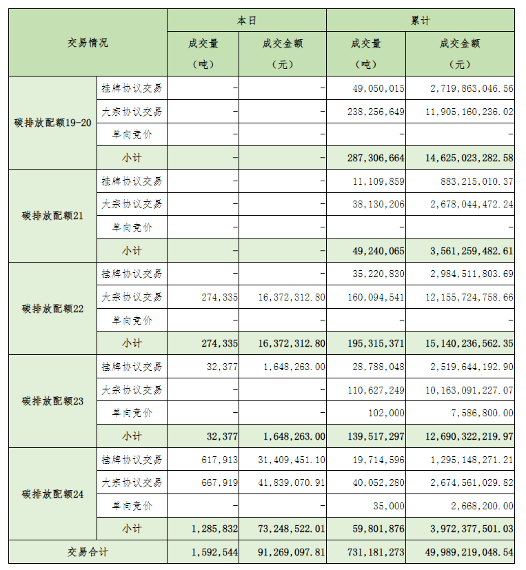 截至今日,全国碳排放权交易市场累计成交总量731,181,273吨,累计成交总额49,989,219,048.54元。