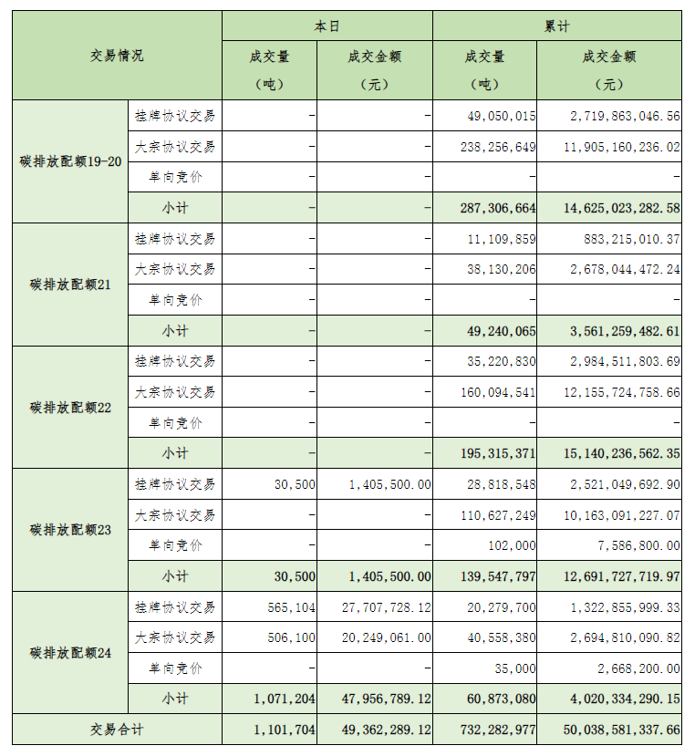 截至今日,全国碳排放权交易市场累计成交总量732,282,977吨,累计成交总额50,038,581,337.66元。