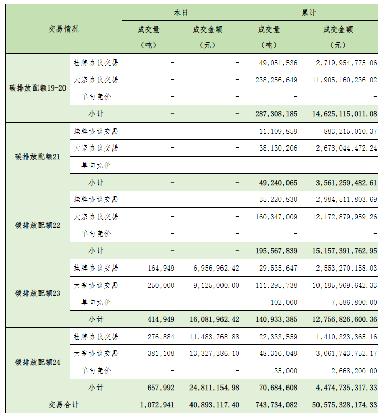 截至今日,全国碳排放权交易市场累计成交总量743,734,082吨,累计成交总额50,575,328,174.33元。