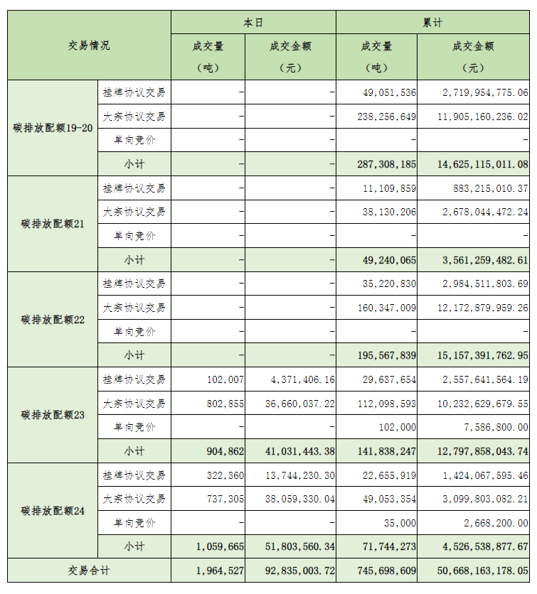 截至今日,全国碳排放权交易市场累计成交总量745,698,609吨,累计成交总额50,668,163,178.05元。