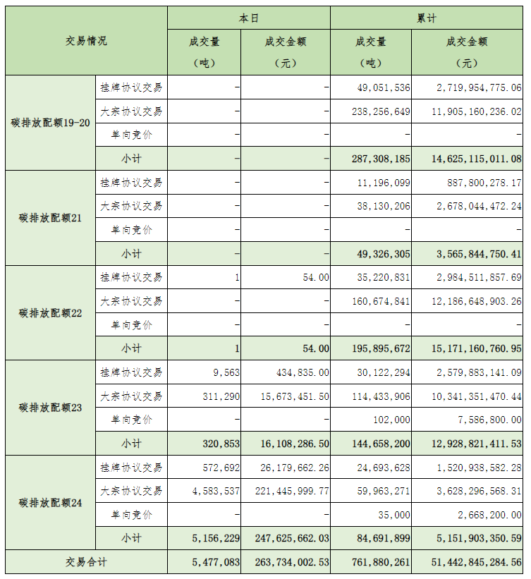 今日全国碳排放权交易市场成交总量5,477,083吨,成交总额263,734,002.53元,成交均价48.15元/吨。
