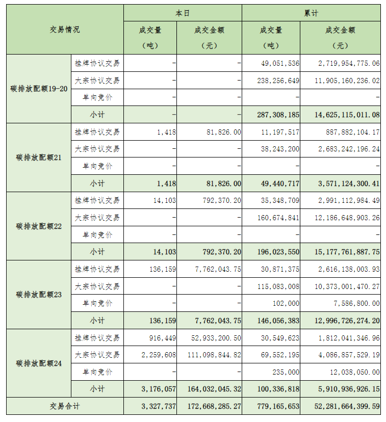 截至今日,全国碳排放权交易市场累计成交总量779,165,653吨,累计成交总额52,281,664,399.59元。