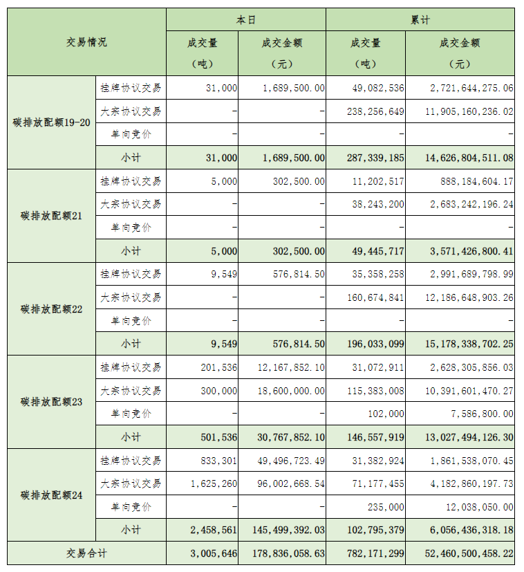 截至今日,全国碳排放权交易市场累计成交总量782,171,299吨,累计成交总额52,460,500,458.22元。