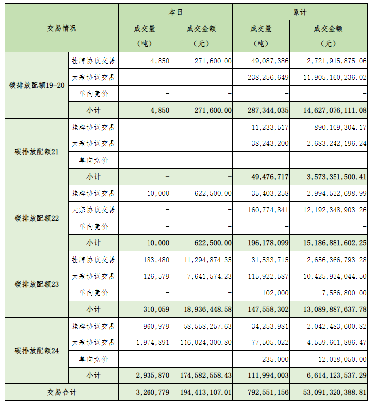 截至今日,全国碳排放权交易市场累计成交总量792,551,156吨,累计成交总额53,091,320,388.81元。
