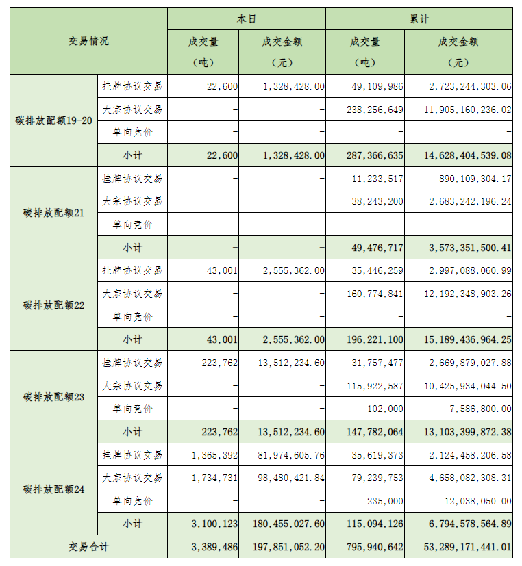 截至今日,全国碳排放权交易市场累计成交总量795,940,642吨,累计成交总额53,289,171,441.01元。