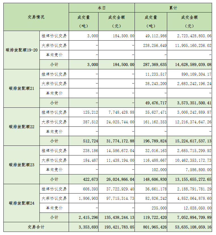截至今日,全国碳排放权交易市场累计成交总量801,965,426吨,累计成交总额53,635,108,059.16元。