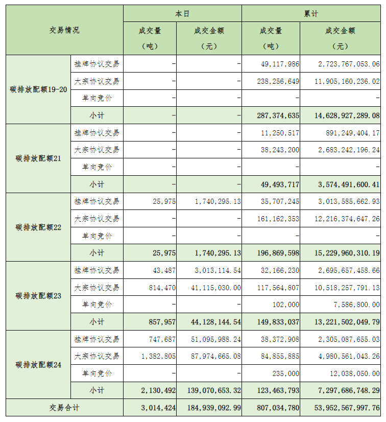 截至今日,全国碳排放权交易市场累计成交总量807,034,780吨,累计成交总额53,952,567,997.76元。