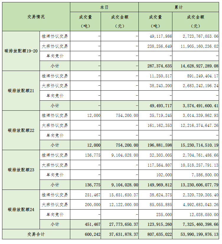 截至今日,全国碳排放权交易市场累计成交总量807,635,022吨,累计成交总额53,990,199,876.13元。